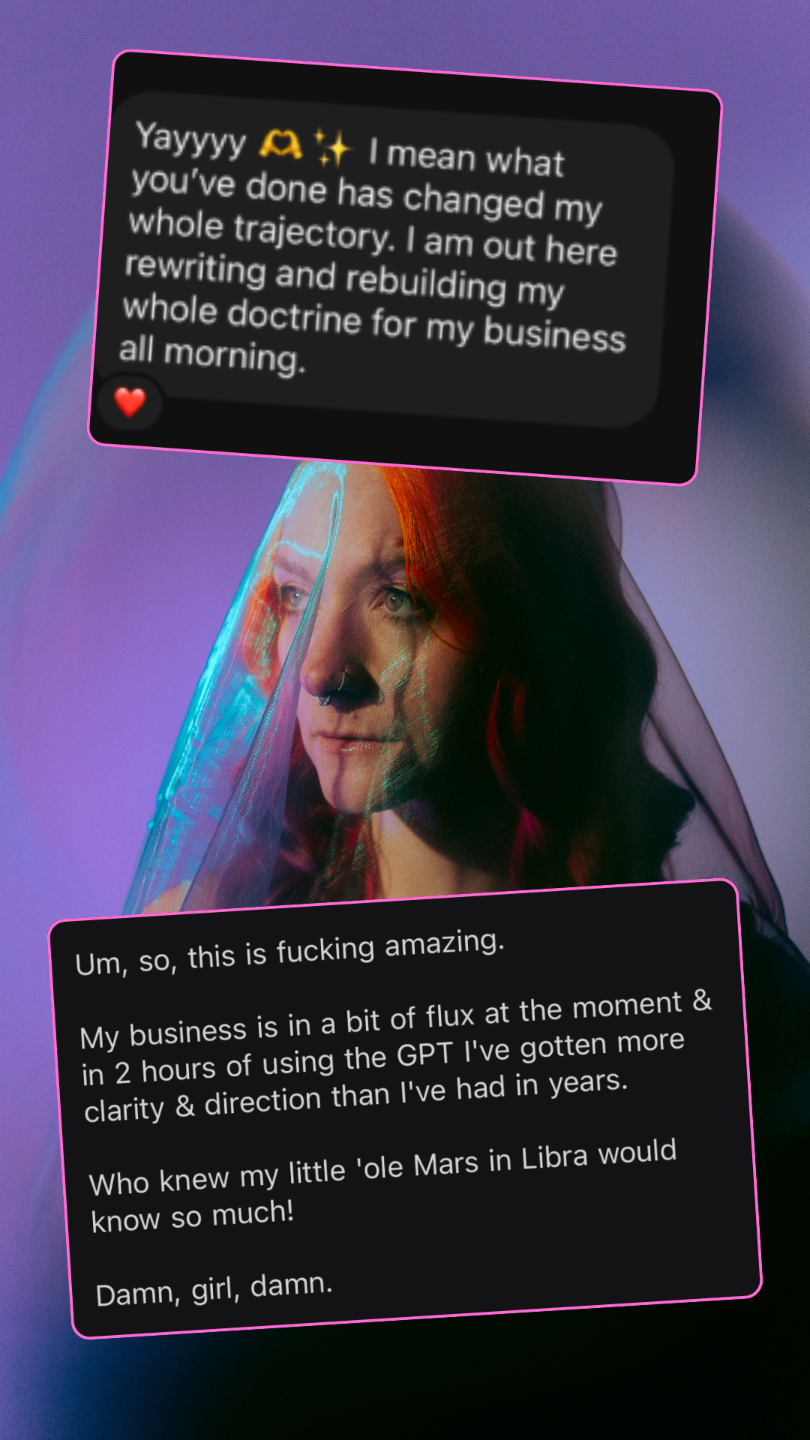 I created Soul Arc Astrology™ and the Magic Mirror Marketing™ Method to translate birth charts into clear, practical business blueprints that actually work in the real world.